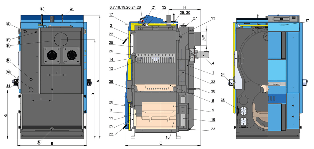 | 18. | Teploměr | L | – výstup vody z kotle |