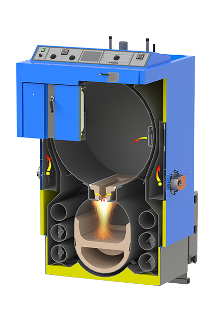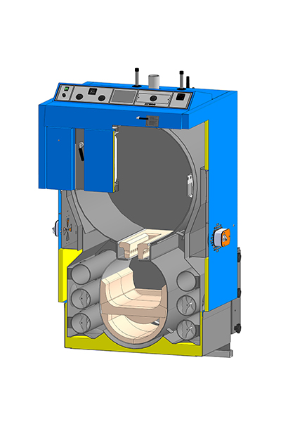 Die Kessel sind für die Verbrennung von Holz konstruiert worden. Die Verbrennung geht auf dem Prinzip der Generatorvergasung unter Nutzung eines Abzugsventilators vonstatten, der die Abgase aus dem Kessel absaugt. Der Kesselkörper ist ein Schweißteil aus Stahlblechen von 3 – 10 mm. Dazu gehört ein brennstoffspeicher, der im unteren Teil mit einem feuerfesten Formstück mit einer länglichen Öffnung für das Durchströmen der Abgase und Gase versehen ist. Der Nachbrennraum unterhalb ist mit keramischen Formteilen bestückt. Im hinteren Teil des Kesselkörpers befindet sich ein senkrechter Brennstoffkanal, wo sich im oberen Teil die Anheizklappe befindet. Der hintere Teil des Sammelkanals ist mit einem Abzugsrohr für den Anschluß an denSchornstein versehen. Die vordere Wand ist im oberen Teil mit einer Nachlegetür und im unteren Teil mit einer Reinigungstür ausgestattet. Auf den beiden Seiten der Reinigungstür gibt es Deckel, hinter denen eine Rohrwand (Wärmetäuscher) mit Segmentenbremser installiert ist. Im vorderen Teil der Oberplatte befindet sich der Hebel der Anheizklappe. Der Kesselkörper ist von außen mit Mineralfilz wärmeisoliert, der sich unter den Blechabdeckungen des Kesselaußenmantels befindet. Im oberen Teil des Kessel finden Sie die Schaltfeld für die elektromechanische Steuerung. Die Primärluft für die optimale Verbrennung im Kessel wird über spezielle, mit den Servoantrieben gesteuerte Klappen seitlich des Kessels zugeführt. Die Sekundärluft wird sowohl von dem vorderen als auch dem hinteren Kesselbereich zugeführt. Die Primär- und Sekundärluft wird auf eine hohe Temperatur vorgewärmt.