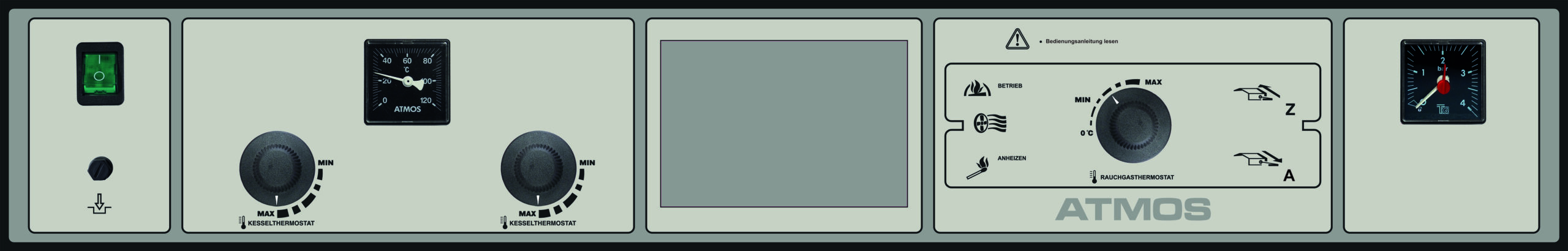 Hauptschalter, Sicherheitsthermostat, Kesselthermostat 1,Thermometer, Kesselthermostat 2, Raum für elektronische Regelung des Heizsystems (92×138 mm),Rauchgasthermostat, Manometer