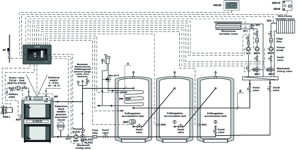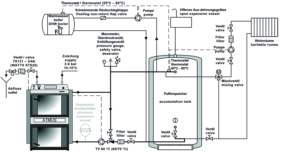 Die ATMOS-Kessel müssen mit LADDOMAT 22 oder dem Thermo-Regelventil ESBE zum Erreichen einer Mindesttemperatur von 65 °C des Wassers am Rücklauf zum Kessel ausgestattet sein. Die Vorlauftemperatur am Kessel muss ständig im Bereich von 80 – 90 °C liegen. Alle Kessel werden in deren Grundausführung mit einem Kühlungskreis gegen Überhitzung geliefert. Wir empfehlen, die Kessel mit Speicherbehältern zu installieren.