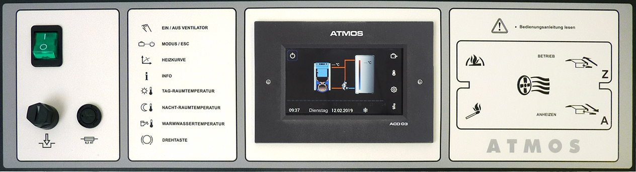 Jeder Kessel kann mit einer modernen Touch-Elektroniksteuerung ATMOS ACD 03 zur Steuerung des gesamten Heizsystems in Abhängigkeit von Außentemperatur, Raumtemperatur und Uhrzeit ausgestattet werden. Diese Regelung ist in der Lage, den Kessel selbst mit einem Ventilator mit vielen anderen Funktionen zu steuern.