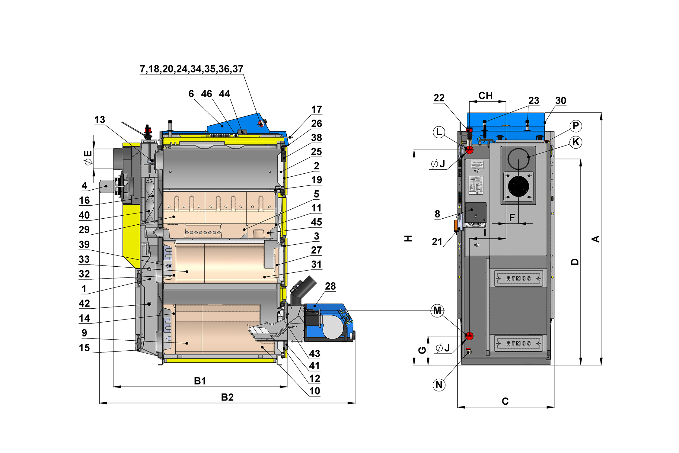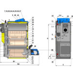| 2. | Fülltür (beim Heizen mit Holz) | 28. | Brenner für Pellets ATMOS A25 / A45 (DC40GSP) |