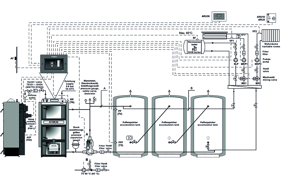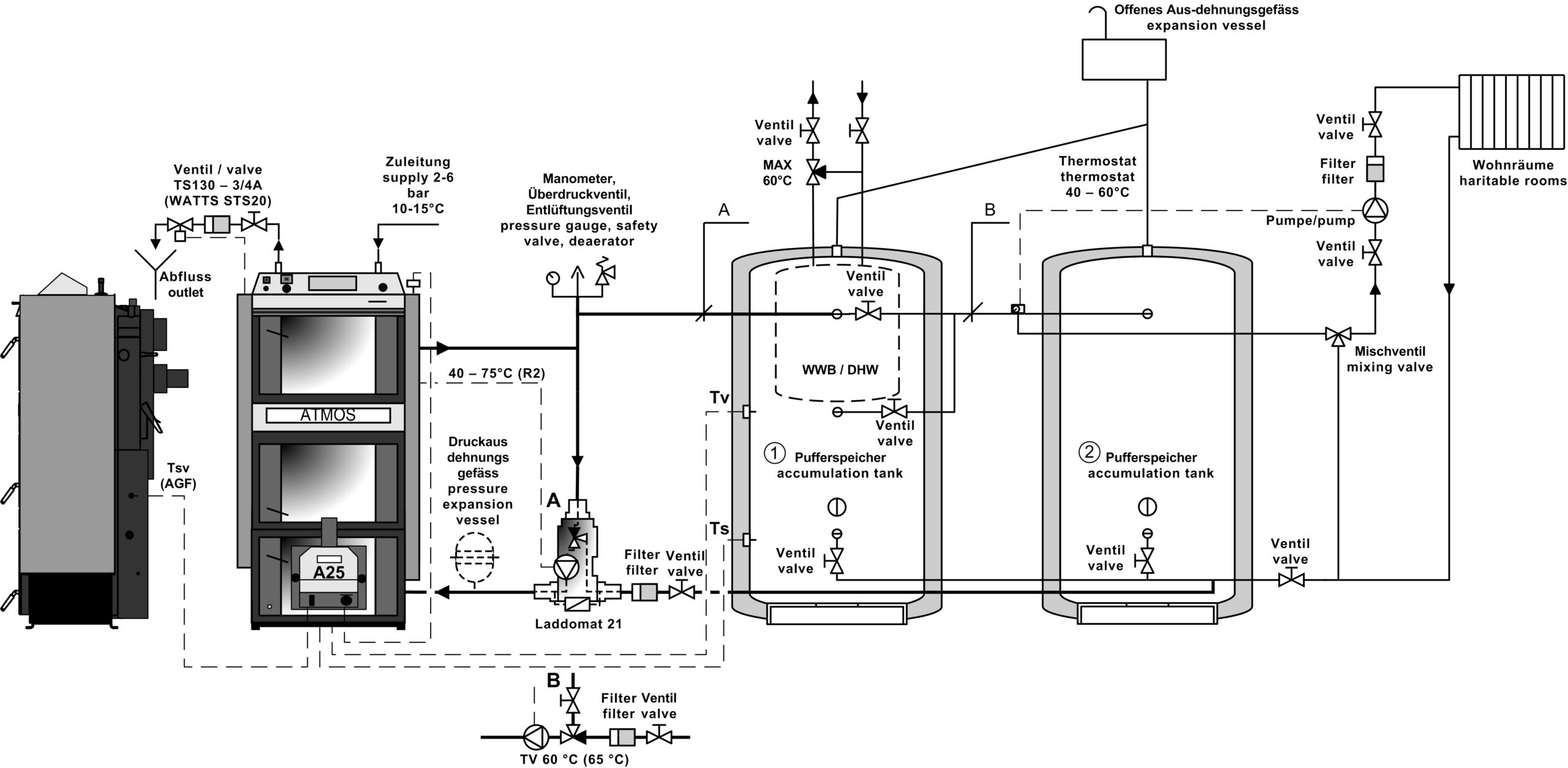 Die ATMOS Kessel sollen immer mit der Rücklaufanhebung zB. Laddomat 22, Thermoregelventil oder Dreiwegermischer mit Servoantrieb angeschlossen werden.