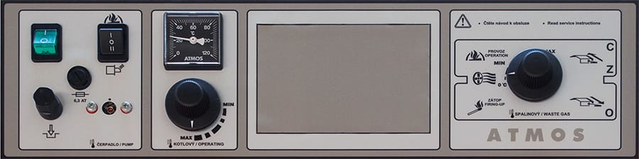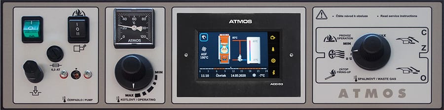 Jeder Kessel kann mit einer modernen Touch-Elektroniksteuerung ATMOS ACD 03 zur Steuerung des gesamten Heizsystems in Abhängigkeit von Außentemperatur, Raumtemperatur und Uhrzeit ausgestattet werden. Diese Regelung ist in der Lage, den Kessel selbst mit einem Ventilator mit vielen anderen Funktionen zu steuern.