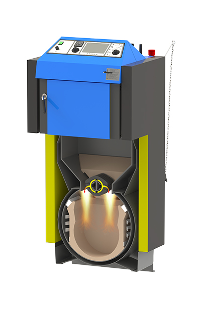 Der Kesselkörper ist als Schweißstück aus Stahlblechen in der Dicke von 6 bis 3 mm hergestellt. Der Kessel besteht aus dem Beschickungstrichter, der im unteren Teil mit einer patentierten Drehrostmechanik mit Zuleitung von Sekundärluft ausgestattet ist. Der untere Nachverbrennungsraum ist mit keramischen Platten ausgelegt, damit die Verbrennung aller benutzten Brennstoffe optimal ist. Im hinteren Kesselteil befindet sich ein senkrechter Verbrennungsgaskanal, der in dem oberen Teil mit einer Ofenklappe bestückt ist. Im oberen Teil des Verbrennungsgaskanals befindet sich ein Abzugsstutzen mit einem Abzugsventilator für den Anschluss an den Schornstein. Im hinteren Kesselteil ist ein Kanal zur Zufuhr von Primär- und Sekundärluft, der mit einer Regulierungsklappe ausgestattet ist.