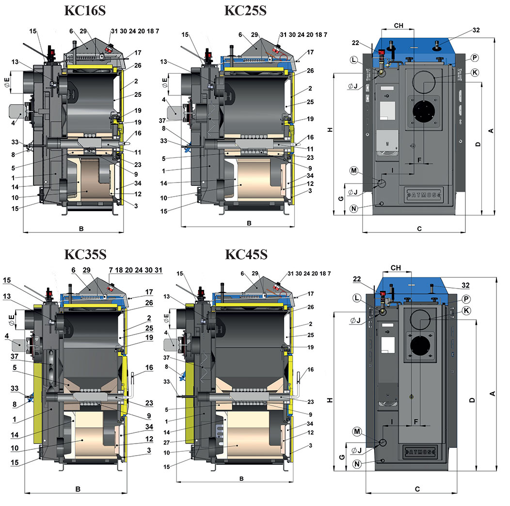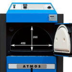 Die wirtschaftlichen Warmwasserkessel ATMOS KC16S, KC25S, KC35S und KC45S sind zum Heizen von Familienhäusern, Wochenendhäusern und anderen ähnlichen Objekten mit Wärmebedarf von 18 – 45 kW bestimmt. Die Kessel wurden zum Verbrennen von Braunkohlebriketts konstruiert. Als Ersatzbrennstoff kann auch Stückholz (Holzscheite) mit einer Länge von 230 – 430 mm verwendet werden. Es kann aber auch mit größeren Steinkohlestücken (WÜRFEL), übrigen Kohle und Holzbriketts geheizt werden. Der Kessel ist zum Verbrennen von Spänen und kleinen Holzabfällen nicht geeignet. Solches Material kann nur in kleinen Mengen mit Kohle oder Holzscheiten verbrannt werden. MAX. 10 %.
