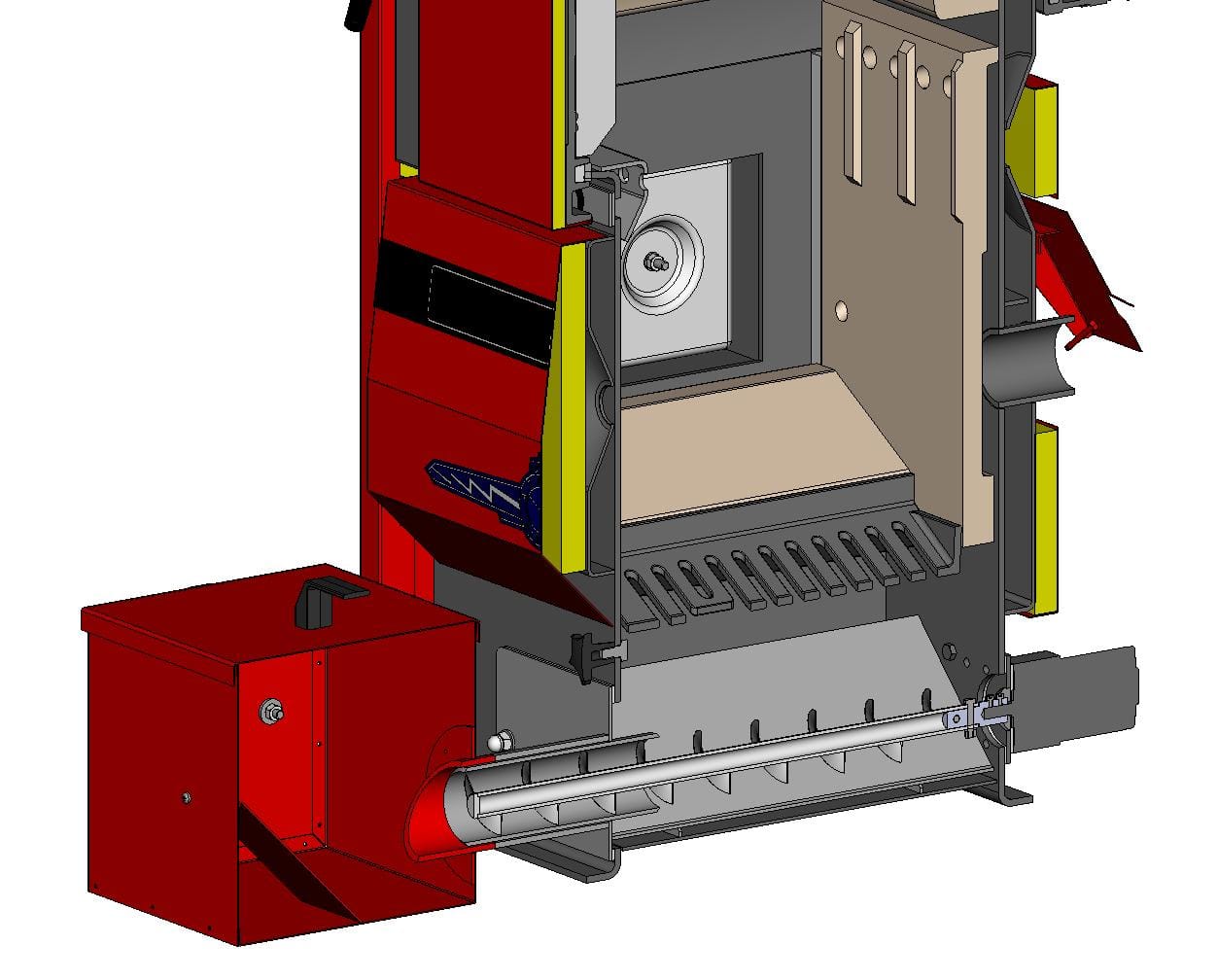 Die Asche wird ganz automatisch mit einem Schneckenförderer mit Getriebe ausgetragen, wobei sie aus der Kammer unter dem Brenner regelmäßig nach 1, 3, 6, 12 oder 24 Stunden in Abhängigkeit vom Brennstoff entleert wird. Die automatische Aschenaustragung kann nach Bedarf auch manuell mit einer auf dem Kessel angebrachten Taste starten oder einstellen. Die Größe des Aschenkastens ist entsprechend dem Aschengehalt im Brennstoff zu wählen.