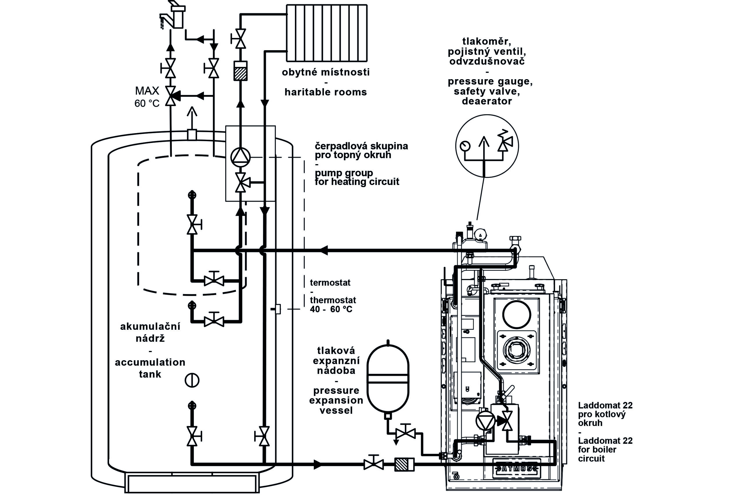 Professioneller rostfreier Anschluss beruhend auf der Rohrleitung 35 x 1,5 mm für die Haltung der Rücklauftemperatur und für das schnelle Anschließen des Kessel mit zwei Verschraubungen 6/4“ mit Flachdichtung. Das Installationsset enthält alle erforderlichen, vom Hersteller verlangten Komponenten – Sicherheitsventil 2,5 bar, Entlüftungsventil, Manometer, Laddomat 22, Set von Rohren für verschiedene Varianten von Kesseln und unverbunden getrennt Pumpengruppe ESBE Typ GRA211 mit handbetätigtem Dreiwegeventil und Pumpe.