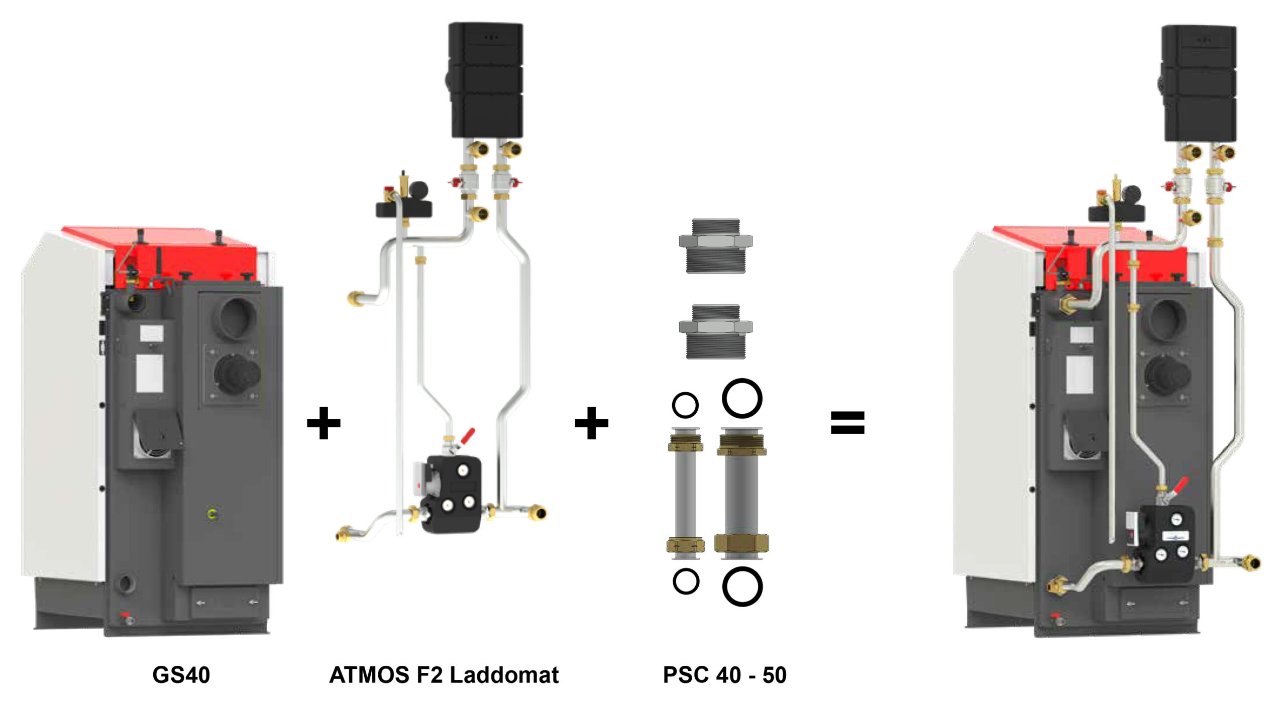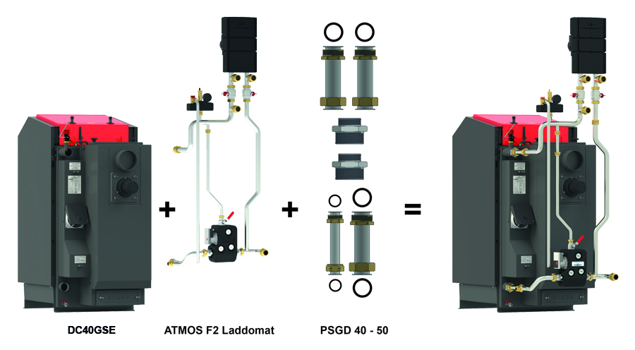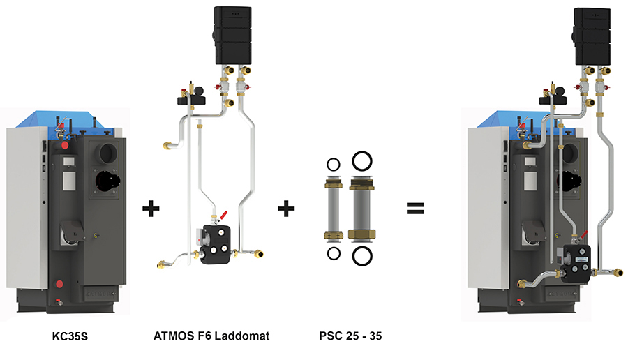 Anschluss ATMOS F6 Laddomat zu Kessel KC35S mit Rohrverlängerungsset PSC 25 – 35. Das Set besteht aus zwei Verbindungsrohren mit Überwurfmuttern und Flachdichtungen.