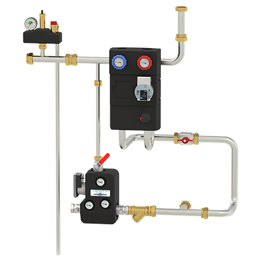 Basic connection consists of: 35 × 1.5 mm stainless steel main pipe, Laddomat X22 with ball valves in the boiler circuit, ESBE GRA211 pump group without actuator for the system circuit, KSG safety set (2.5 bar – 1″ vent and safety valve, pressure gauge), 6/4″ ball valves, filter with magnet, special brass nipples and half screw coupling with a flat seal for connection of the accumulation tank, Ø 35 × 144 mm and Ø 22 × 144 mm extension tubes.