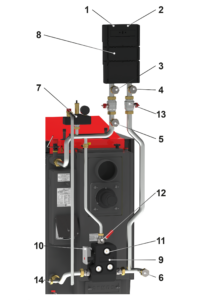 Professional stainless steel connection based on 35 × 1,5 mm diameter pipe, designed to maintain a minimum temperature of return water to the boiler and quickly connect the boiler using two 6/4“ flat seal fittings. The connection includes all the necessary components required by the manufacturer (safety valve 2.5 bar, vent valve, manometer, two pumps, two shut-off valves, three-way valve and, for variants F3 and F4, two servo actuators). The connection is ready to connect the boiler directly to the heating system or to connect the boiler to accumulation tanks. In the case of a larger heating system, the connection can be extended to two or three heating circuits by purchasing a special distributor and the necessary pump group.