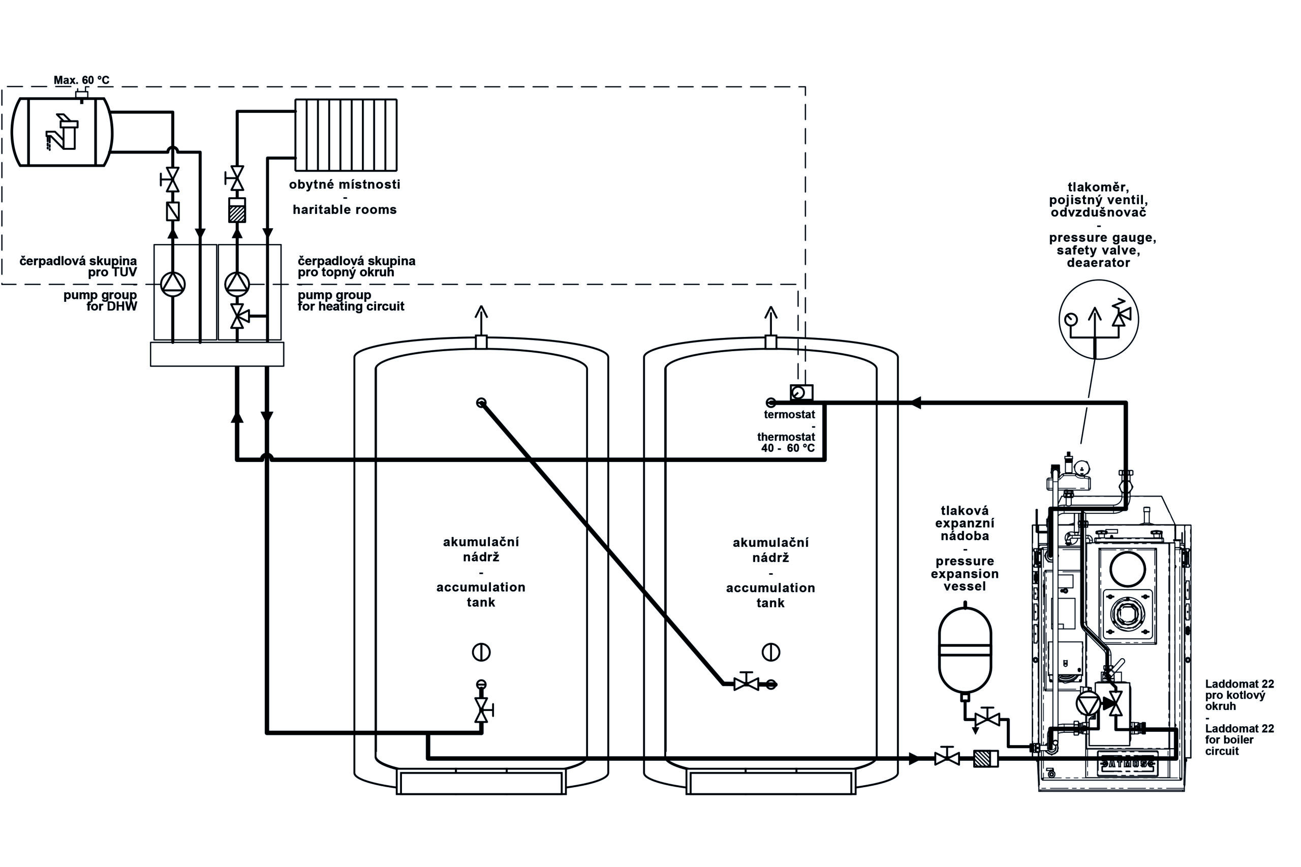 Professional stainless steel connection based on 35 × 1.5 mm diameter pipe, designed to maintain a minimum temperature of return water to the boiler and quickly connect the boiler using two 6/4“ flat seal fittings. The connection includes all the necessary components required by the manufacturer (safety valve 2.5 bar, vent valve, manometer, Laddomat 22, set of pipes for different variants of boilers and unconnected separate pump group ESBE type GRA211 with manually operated three-way valve and pump.