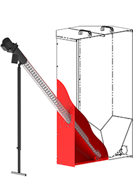 This conveyor is primarily designed for gasification boilers with a built-in burner in the upper feed door – DCxxS (X), DCxxRS, CxxS, ACxxS. However, it can also be used for standard pellet boilers type DxxP.