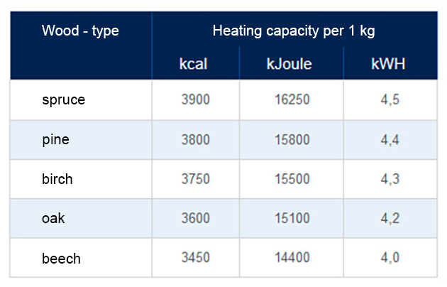 Wood with 12 – 20 % water has a heat value of 4 kWh / 1 kg of wood