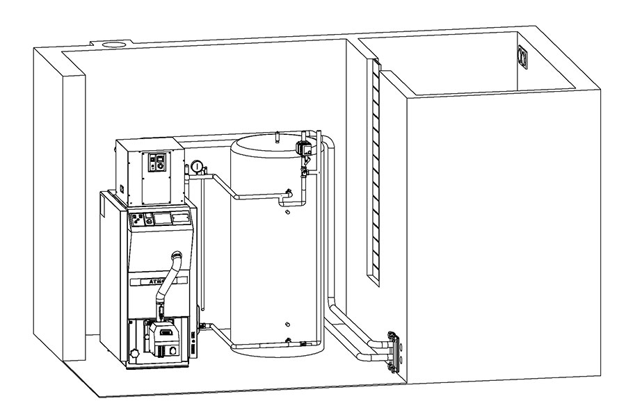 - All in one – boiler, screw conveyor and special burner and pellet hopper for 1 to 3 days in a small area