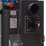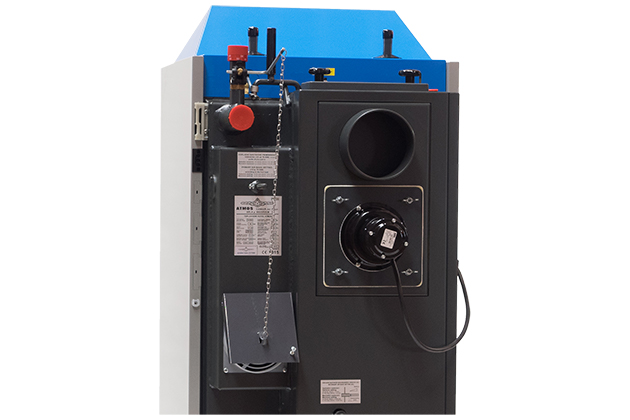 Electromechanical regulation – boiler performance is regulated by an air regulating valve controlled by a draft regulator, FR 124 type, which automatically opens or closes the air valve according to the set water outlet temperature (80 – 90 °C). In addition to performance regulation, the draft regulator helps protect the boiler against overheating. Its advantage is a quick ignition and firing up to the required output when the air valve is fully open. The boilers are equipped with a control thermostat on the instrument panel, which controls the exhaust fan according to the set water outlet temperature (80 – 85 °C) and a flue gas thermostat, which is used to shut down the boiler and turn off the exhaust fan after the fuel has burned out. In the case of connecting a boiler with accumulation tanks, the flue gas thermostat also controls the operation of the pump in the boiler circuit.