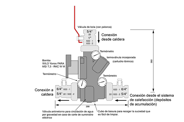 - Laddomat 22 – 3x 5/4″ rosca interior; recomendado para calderas de hasta 100 kW