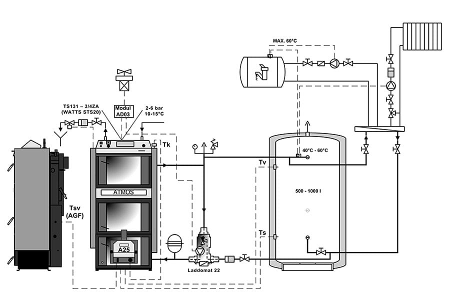 La conexión recomendada es conectar la caldera con Laddomat 22 o una válvula termorreguladora con un depósito de inercia de 500 a 1000 l. Otra opción es instalar la caldera con acumuladores del volumen necesario (por ejemplo, 2000 l), que también permiten calentar el acumulador mediante electricidad o conexión de paneles solares.