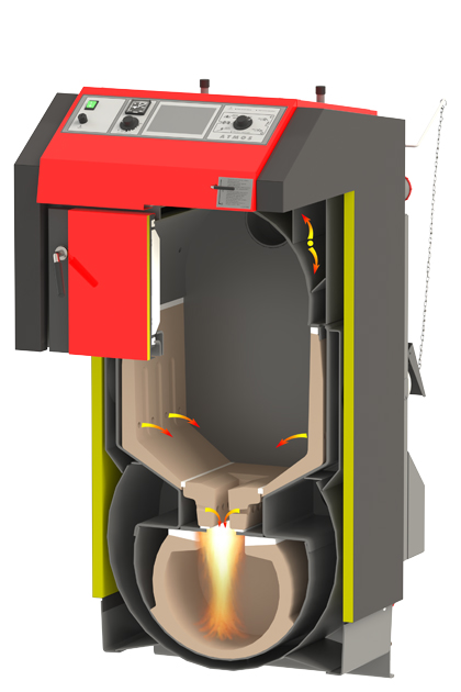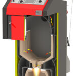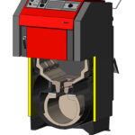 Entre la puerta superior e inferior hay un dispositivo de encendido automático de la leña (una cámara con una espiral incandescente). Para el encendido, se utilizan pellets de madera de alta calidad para llenar la cámara de ignición. La cantidad de pellets corresponde al tamaño de la hoja suministrada con la caldera.