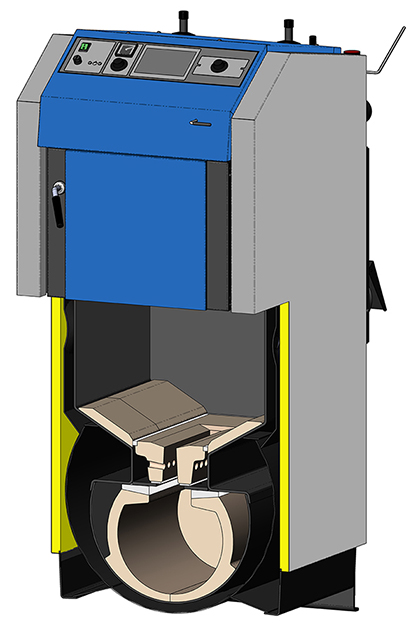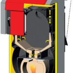 Regulación electromecánica – el rendimiento de la caldera se regula mediante una válvula reguladora de aire controlada por un regulador de tiro, tipo FR 124, que abre o cierra automáticamente la válvula de aire según la configurada temperatura de salida del agua (80 – 90 °C). Además de regular la potencia, el regulador de tiro ayuda a proteger la caldera contra el sobrecalentamiento. Su ventaja es un encendimiento rápido y un aumento hasta la potencia requerida cuando la compuerta de aire está completamente abierta. Las calderas están equipadas con un termostato de control en el panel de instrumentos, que controla el extractor de aire según la configurada temperatura de salida del agua (80 – 85 °C) y un termostato de gases de combustión, que se utiliza para apagar la caldera y apagar el ventilador de escape después de que se haya quemado el combustible. En el caso de conectar una caldera con un depósito de almacenamiento, el termostato de humos también controla el funcionamiento de la bomba en el circuito de caldera.