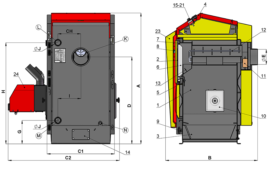 Están diseñadas para una combustión perfecta de los pellets, de modo que en el lado izquierdo o derecho de la caldera, según las necesidades del cliente, se incorpora un quemador de pellets que toma los pellets de la tolva de forma totalmente automática, mediante un transportador helicoidal. La tolva de combustible suele estar situada junto a la caldera o en una sala de al lado y puede ser de cualquier tamaño (estándar 250, 500 o 1000 l). A menudo se utiliza una parte de la sala de calderas como depósito de combustible, que entonces es suficiente para toda la temporada de calefacción.