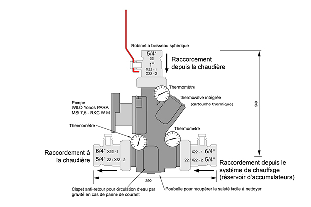 Avec sa construction avec un corps massif en fonte, il remplace le raccordement classique des raccords hydrauliques individuels du circuit chaudière (vanne de thermorégulation, pompe, clapet anti-retour, robinets à tournant sphérique, thermomètres, raccords et isolation). Laddomat 22 peut être utilisé pour des chaudières d’une puissance de 15 à 100 kW. Le Laddomat 22 est fourni avec une thermocartouche 78 °C et une thermocartouche 72 °C de rechange placée dans un isolant polystyrène. Nous utilisons la cartouche thermique 72 °C pour les chaudières de plus de 32 kW ou pour les installations sans ballon d’accumulation, où il n’est pas nécessaire d’exiger une température de fonctionnement plus élevée de la chaudière. La connexion avec Laddomat 22 est beaucoup plus simple et nous ne pouvons donc que le recommander.