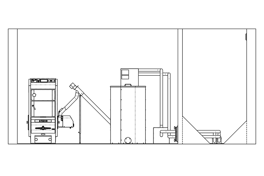 - Chaufferie et silo à granulés avec aspiration multipoint de granulés avec alimentateur pneumatique