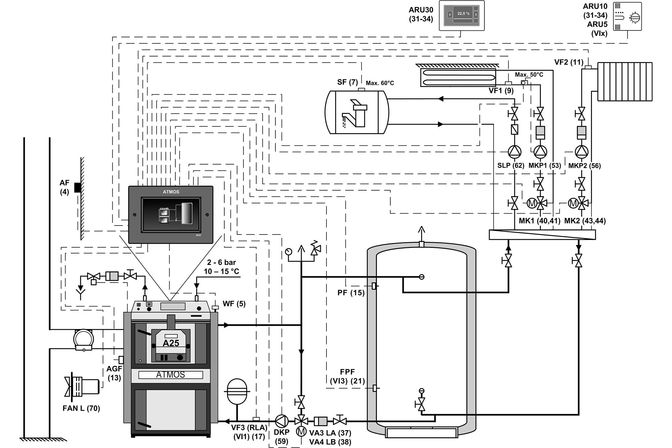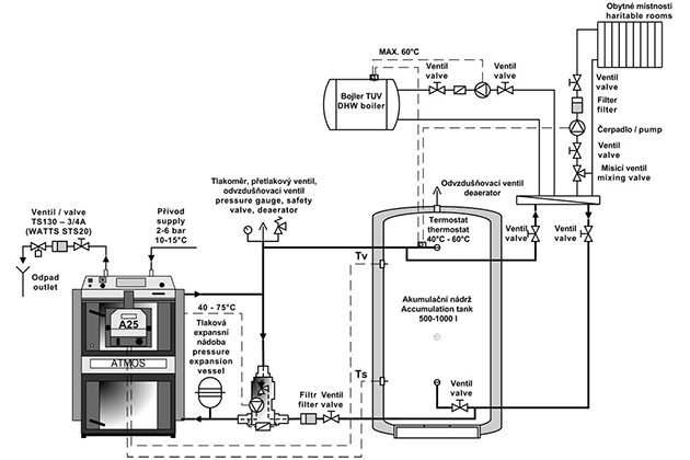 Le raccordement recommandé de la chaudière est le raccordement avec un Laddomat 22 ou une vanne de thermorégulation et un réservoir tampon d’un volume de 500 ou 1000 l pour obtenir une faible consommation de combustible et une longue durée de vie du brûleur et de la chaudière. Pour des économies de combustible supplémentaires (jusqu’à 20 %) et une fonction de charge correcte du réservoir tampon, utilisez la régulation spécialement développée ATMOS ACD 03 ou les capteurs TV et TS, qui sont destinés aux fonctions spéciales du brûleur ATMOS A25 et sont situés sur le réservoir tampon (d’accumulation). L’unité de commande surveille le chauffage du réservoir tampon (d’accumulation) de manière entièrement automatique et garantit qu’il y a toujours assez d’énergie pour le système de chauffage. Cette méthode de raccordement vous permettra d’économiser du combustible, de l’électricité et d’augmenter la durée de vie du brûleur à granulés de bois.