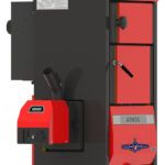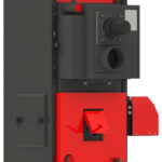 Les chaudières sont conçues de telle manière qu’un brûleur à granulés ATMOS A85 est intégré dans leur côté gauche ou droit avec nettoyage pneumatique de la chambre de combustion du brûleur et de l’échangeur tubulaire. Le corps des chaudières est constitué d’une pièce soudée en tôle d’acier d’une épaisseur de 3 à 6 mm. Il se compose d’une chambre de combustion avec une grande voûte, et dans la partie inférieure de la chambre il y a une fente vers un canal avec un convoyeur à vis pour enlever les cendres vers un grand réservoir externe (160 l) pour l’enlèvement automatique des cendres. La paroi avant de la chaudière est équipée d’une porte de nettoyage en partie haute, derrière laquelle un rideau en inox avec une fenêtre assurant la protection de la porte contre la surchauffe est inséré. Dans la partie arrière de la chaudière, il y a un échangeur de chaleur tubulaire équipé de freins à segments avec une fonction de nettoyage automatique sans qu’il soit nécessaire de les retirer. Le corps des chaudières est isolé thermiquement par l’extérieur avec de la laine minérale insérée sous les couvertures en tôle de l’enveloppe extérieure des chaudières. Dans la partie supérieure des chaudières, il y a un panneau avec l’interrupteur principal, l’interrupteur de décendrage automatique, l’interrupteur du brûleur à granulés de bois (L2), le thermostat de fonctionnement (régulation), le thermostat de la pompe, le thermostat de sécurité, le thermomètre et le fusible de 6,3 A. La chaudière n’est pas équipé d’une boucle de refroidissement contre la surchauffe, car grâce à la faible quantité de combustible dans le brûleur, il n’y a aucun risque de surchauffe de la chaudière en cas de coupure de courant électrique. La chaudière D85P est équipée d’un ventilateur d’extraction avec capteur de vitesse.