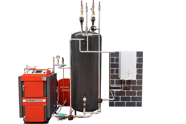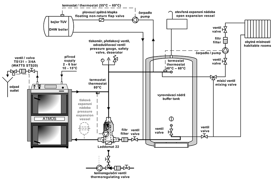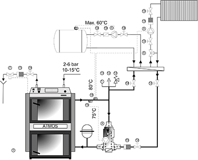 Au fur et à mesure que la température de l’eau de retour à la chaudière augmente, la condensation des goudrons acides diminue = durée de vie de la chaudière plus longue. Nous recommandons donc d’utiliser le Laddomat 22, la vanne thermorégulatrice TV 65/70/75 °C ou la vanne trois voies pilotée avec servomoteur, régulation ACD 03/04 et pompe. La solution idéale est donc une installation avec le raccordement d’origine de la chaudière ATMOS F5, F6, F7, F8 ou F13.