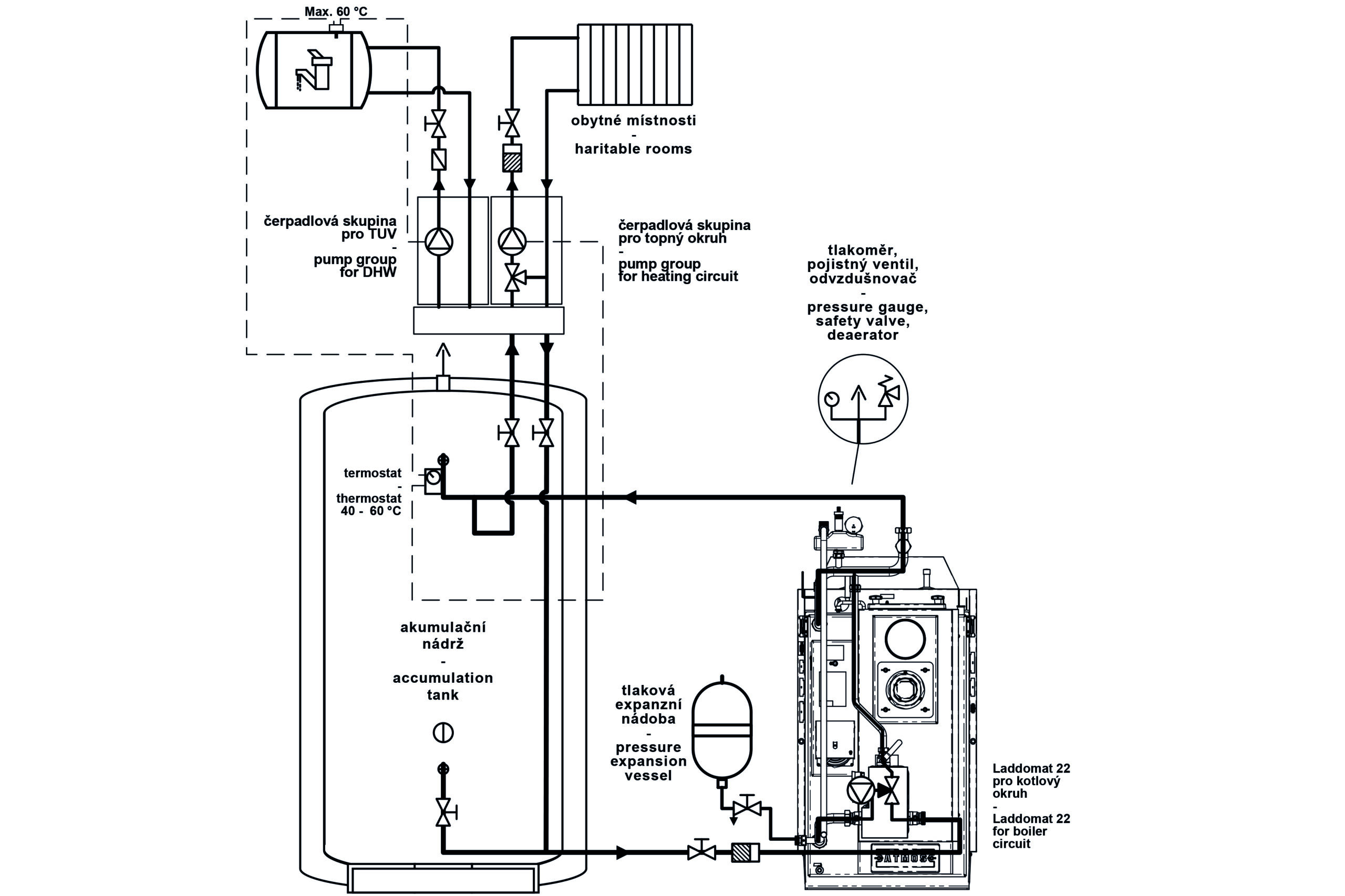 Il collegamento (circuito della caldaia) è predisposto per poter collegare la caldaia direttamente al sistema di riscaldamento o per collegare la caldaia con serbatoi di accumulo. Il collegamento consente l’utilizzo di gruppi di pompaggio ATMOS/ESBE, che possono essere espansi a due o tre circuiti di riscaldamento per un impianto di riscaldamento più grande acquistando un distributore speciale e il gruppo di pompaggio necessario. L’attacco può essere collegato anche ad una valvola a tre vie separata standard e ad una pompa nel circuito dell’impianto di riscaldamento.