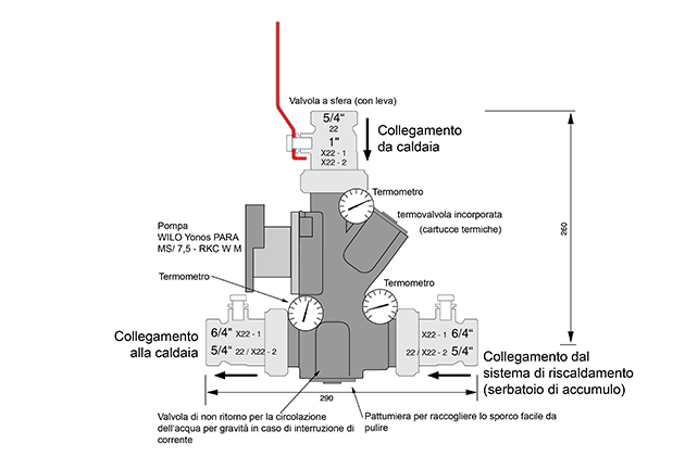 - Laddomat X22-1 – 2x filettatura esterna 6/4″; 1x filettatura esterna 1″; consigliato per caldaie fino a 50kW