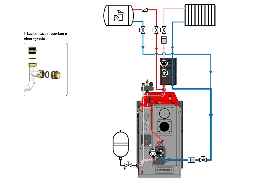 Collegamento professionale in acciaio inox adatto al tubo di diametro 35 x 1,5 mm, previsto per mantenere la temperatura minima dell’acqua di ritorno alla caldaia e per collegare rapidamente la caldaia mediante due raccordi a vite da 6/4″ con guarnizione piatta. Il collegamento comprende tutti i componenti necessari richiesti dal fabbricante (valvola di sicurezza da 2,5 bar, valvola di sfiato, manometro, Laddomat 22 e un gruppo pompa separato non collegato di tipo ESBE GRA211 con valvola a tre vie a comando manuale e pompa). Il collegamento è predisposto per poter collegare la caldaia direttamente al sistema di riscaldamento o per collegare la caldaia con serbatoi di accumulo. Per i sistemi di riscaldamento di maggiori dimensioni, il collegamento può essere ampliato a due o tre circuiti di riscaldamento, acquistando un distributore speciale e un gruppo pompa idoneo.