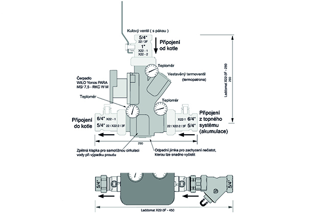Laddomat X22-2 – horní vývod 1″- vnější závit, připojení do kotle a z topného systému 5/4″ – vnitřní závit, doporučen do 50 kW: Objednací kód: P0262
