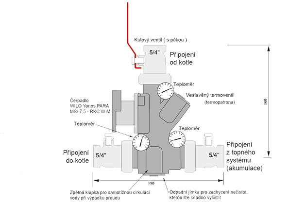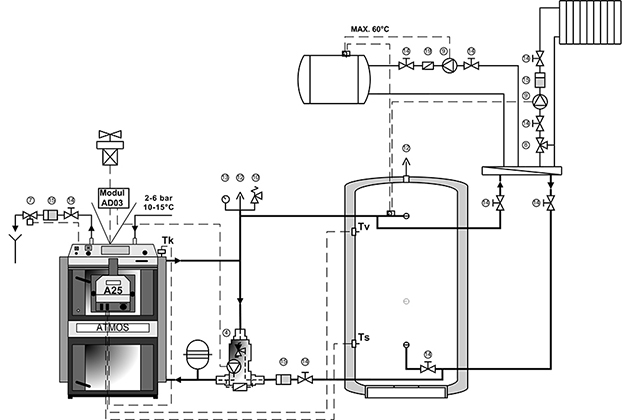 Wraz ze wzrostem temperatury wody powracającej do kotła zmniejsza się kondensacja kwaśnych smół = dłuższa żywotność kotła. Dlatego zalecamy stosowanie Laddomat 22, zaworu termoregulacyjnego TV 65/70/75 °C lub sterowanego zaworu trójdrogowego z serwonapędem, regulatorem ACD 03/04 i pompą.