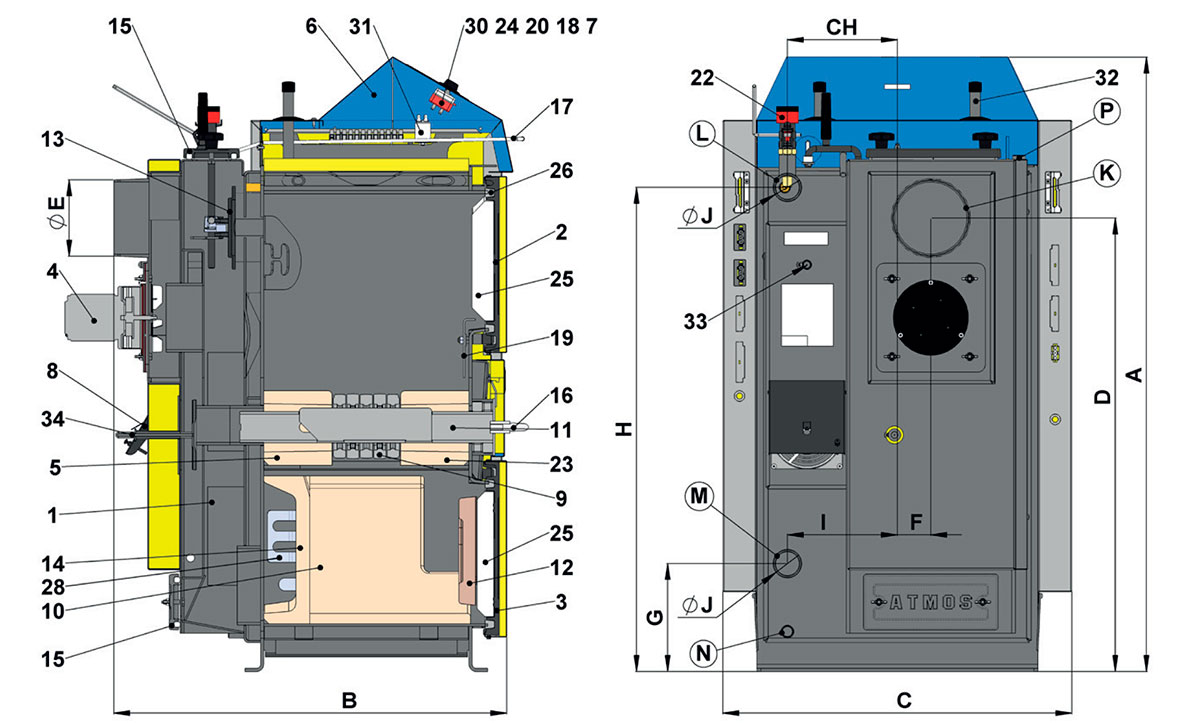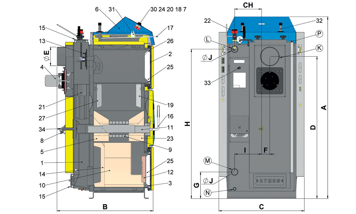 Zaletą regulacji i konstrukcji kotłów ATMOS jest to, że kotły pracują przy dobrym ciągu kominowym do 70 % mocy znamionowej nawet bez wentylatora.