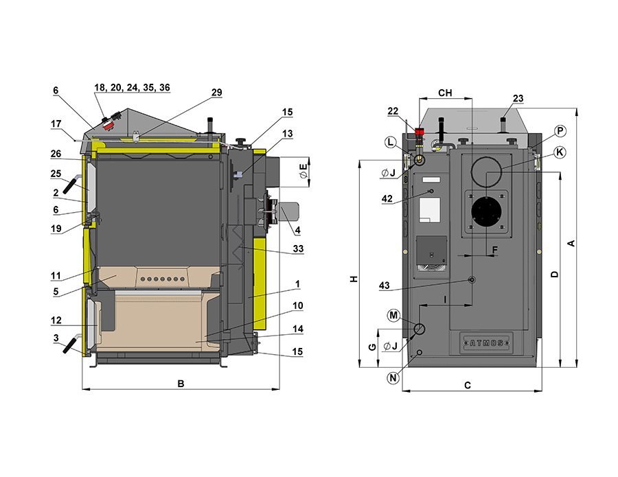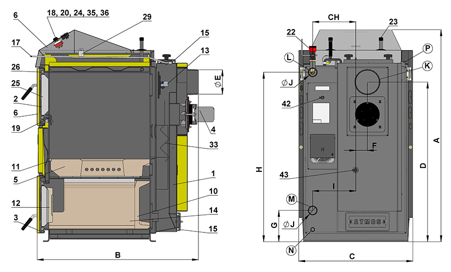 Najlepiej sprzedające się kotły Drewnogaz charakteryzują się dużą przestrzenią załadunkową. Powietrzem pierwotnym dostarczanym w górnej części paleniska górnego. Dyszą zgazowującą z otworami do podawania mocno podgrzanego powietrza wtórnego, przez które płomienie przedostają się z paleniska górnego do dolnej komory spalania. Tylnym kanałem spalinowym z wymiennikiem zapewniającym dobrą efektywność kotła oraz wentylatorem odprowadzającym spaliny do komina. Korpus kotła ATMOS Drewnogaz został wykonany jako konstrukcja spawana z wysokiej jakości blach stalowych o grubości od 8 do 3 mm.