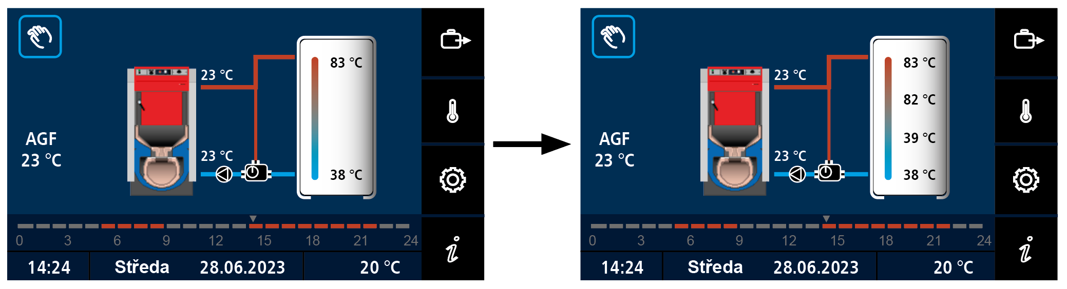 Po zatopení kotle nabijeme při provozu na maximální výkon (na 2 až 4 naložení) daný objem akumulačních nádrží na požadovanou teplotu vody 90 – 100 °C. Kotel poté necháme dohořet. Dále už jen odebíráme teplo ze zásobníku za pomoci trojcestného ventilu a to po dobu, která odpovídá velikosti akumulátoru a venkovní teplotě. V topném období (při dodržení minimálních objemů akumulátorů viz tabulka) to může činit 1 – 3 dny. Nelze-li použít akumulaci, doporučujeme alespoň jednu nádrž o objemu 500 – 1000 l pro vyrovnávání náběhů a doběhů kotle.