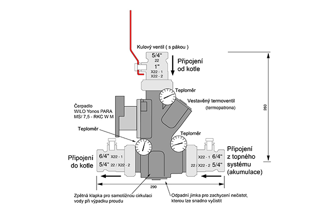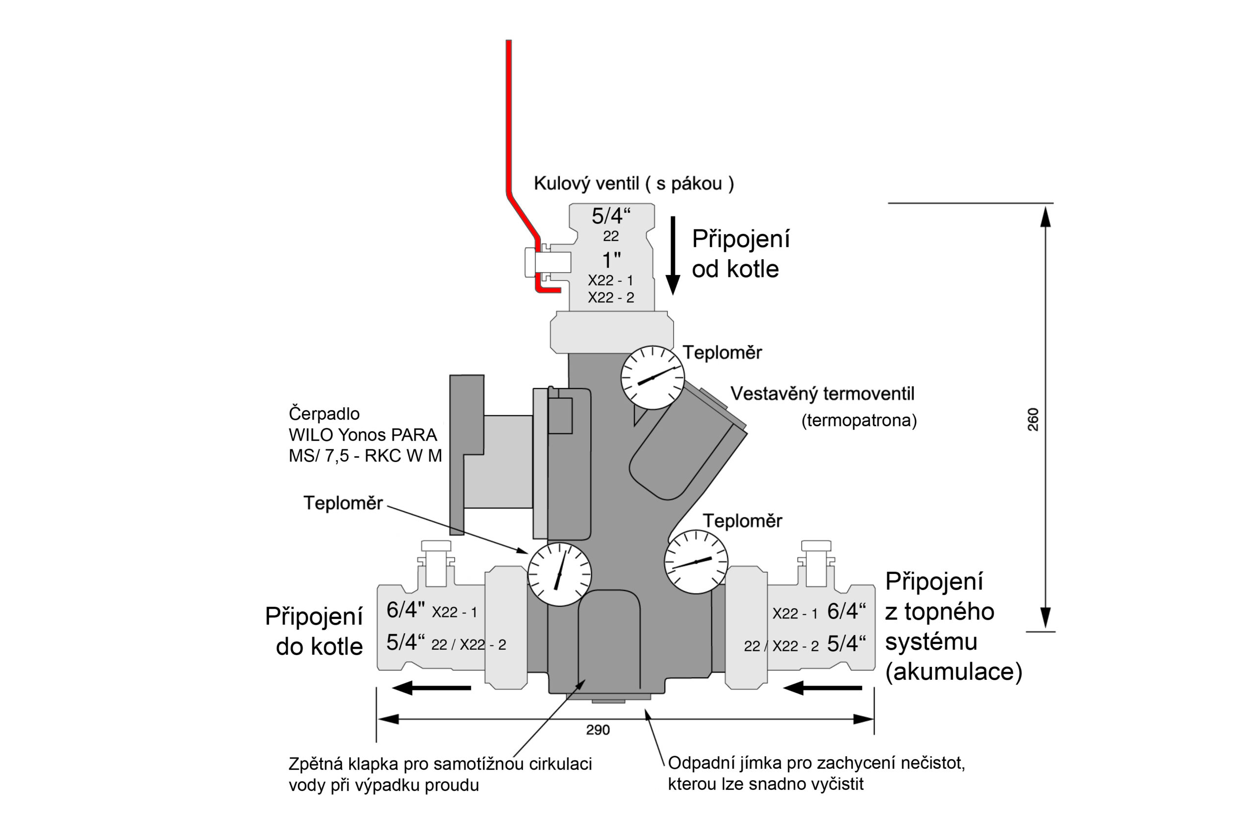 - Laddomat X22-1 – 2x 6/4″ vnější závit; 1x 1″ vnější závit; doporučen pro kotle do 50 kW