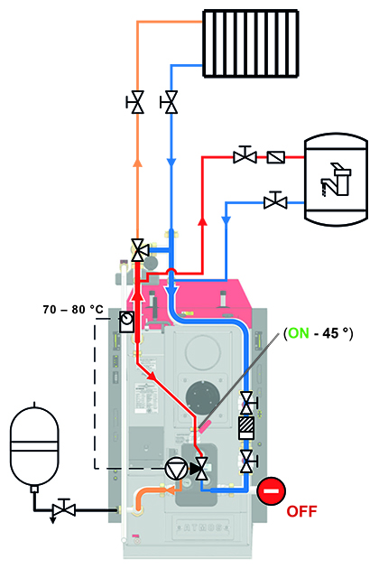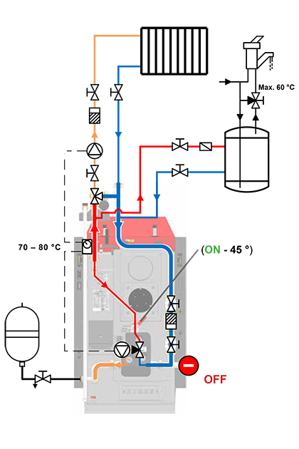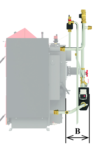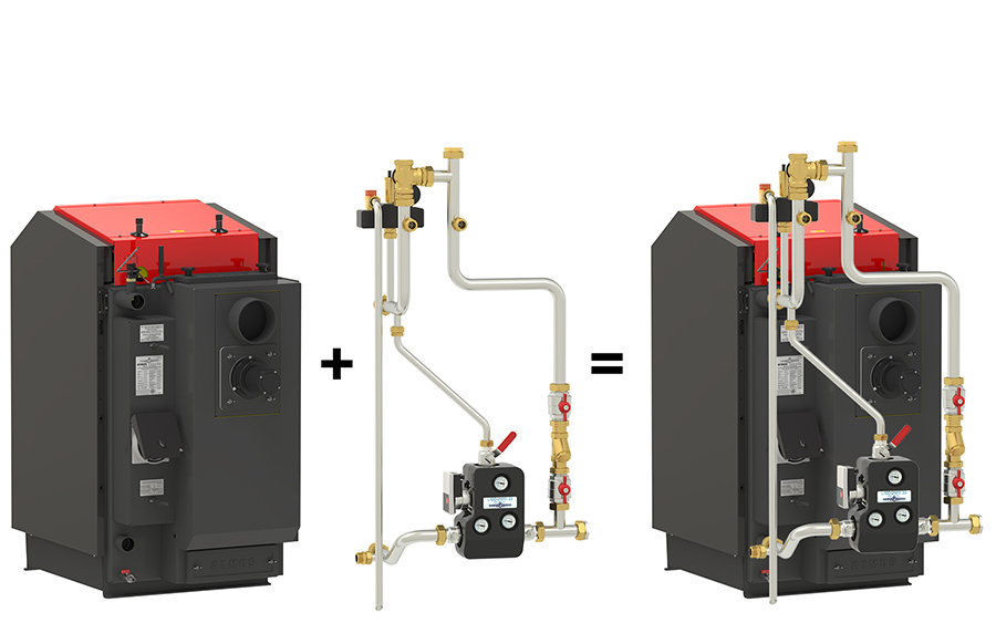 Zapojení je zkonstruováno pro rychlé zapojení kotle přímo do topného systému. Zapojení obsahuje 5/4“ vstup a výstup pro napojení topného okruhu a 1“ vstup a výstup pro napojení bojleru pro ohřev teplé užitkové vody (TUV).