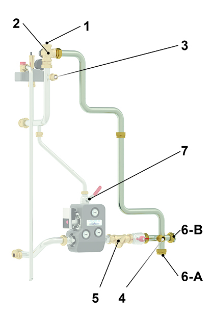 Zapojení obsahuje všechny potřebné komponenty, které vyžaduje výrobce (pojišťovací ventil 2,5 bar, odvzdušňovací ventil, manometr, Laddomat X22-1, filtr s magnetem, dva uzavírací ventily, ručně ovládaný trojcestný ventil). Čerpadlo topného okruhu není součástí dodávky zapojení F722 a doplňujeme ho vždy, když dobře nefunguje samotíž topného systému.
