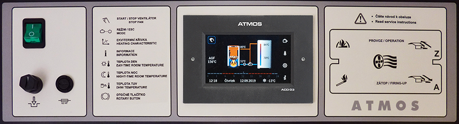 Fiecare cazan poate fi echipat cu un control electronic tactil modern ATMOS ACD 03 pentru controlul intregului sistem de incalzire in functie de temperatura exterioara, temperatura camerei si timp. Această reglare este capabilă să controleze centrala în sine cu un ventilator cu multe alte funcții.