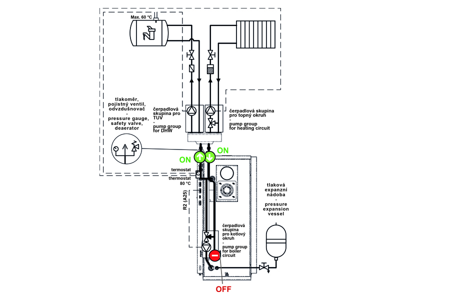 Профессиональный комплект подключения из нержавеющей стали, состоящий из труб диаметром 22 x 1,5 мм, предназначен для поддержания минимальной температуры обратной воды, поступающей в котёл, и быстрого подключения котла с помощью двух резьбовых соединений 1” / 6/4“ с плоской прокладкой. В состав комплекта подключения входят все необходимые компоненты, предусмотренные производителем (предохранительный клапан на 2,5 бар, воздуховыпускной клапан, манометр, два насоса, два запорных клапана, трёхходовой клапан). Комплект подключения готов для подключения котла непосредственно к системе отопления или для подключения котла к аккумулирующим бакам. Комплект подключения позволяет расширить систему отопления до двух или трёх отопительных контуров путём приобретения специального коллектора и необходимой насосной группы (с установочной длиной 90 мм — 1“ ↑↓ 1“).