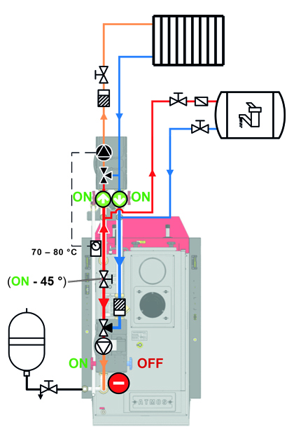 При таком подключении бойлер для нагрева ГВС во время работы котла заправляется непосредственно насосом в котловом контуре (дополнительный насос не требуется). Температура воды в бойлере соответствует рабочей температуре котла.
