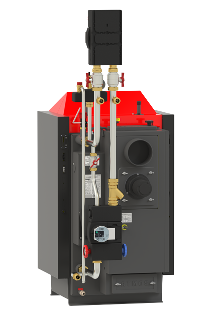 При монтаже рекомендуется использовать оригинальный комплект подключения ATMOS, например, F71 ESBE, F1 — F4, F12 Laddomat, F21 — F22 (только контур котла) или F31 и F32 AKU в случае подключения к накопительным бакам. После котла ATMOS необходимо создать так называемый котловой контур, содержащий LADDOMAT 22 или термостатический клапан (для электронного контроллера ACD 03/04 – трехходовой клапан, управляемый серводвигателем), с минимальной температурой обратной воды в котле. 65 °С. Температуру воды на выходе из котла необходимо постоянно поддерживать в пределах 80 – 90 °С, а на смесительном трехходовом кране выставляем температуру воды на радиаторы или теплый пол по мере необходимости (напр. 30 – 80 °С).