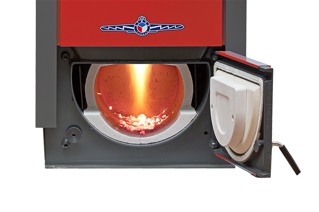 Между верхней и нижней дверцами встроено автоматическое устройство для розжига дров (камера со спиралью розжига). Для розжига используются высококачественные древесные пеллеты, которыми заполняется камера розжига. Количество пеллет соответствует размеру лопатки, поставляемой с котлом.