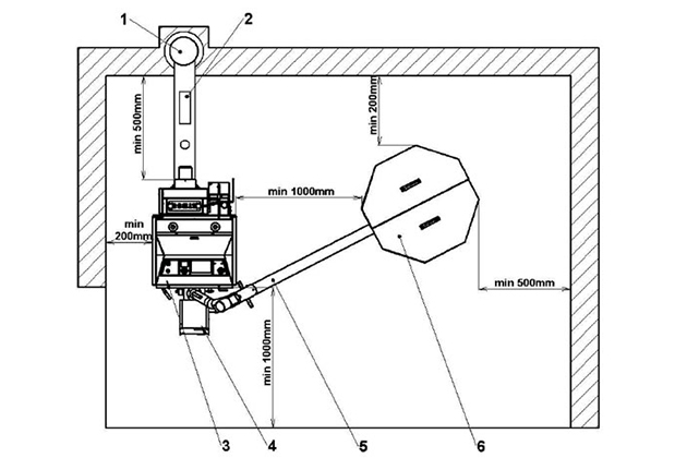 При установке горелки в верхнюю дверцу газификационного котла необходимо использовать конвейер длиной не менее 2 метров, чтобы длина шланга между конвейером и горелкой в ​​целях безопасности составляла не менее 20 см.